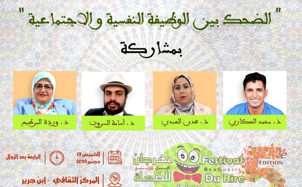 في إطار فعاليات النسخة الخامسة لمهرجان ابن جرير للضحك، التي تنظمها "جمعية ابتسامة" تحت شعار "لنضحك من أجل الحياة"، يشهد المركز الثقافي بمدينة ابن جرير تنظيم جلسة فكرية هامة موسومة بـ: "الضحك بين